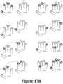 Shift assignment is used in some embodiments when home positions are not suitable, such as when the user has repositioned the hand after some period of time, or after switching back from keyboard operation.FIG.18B provides several examples of shift assignments which map touches to fingers without regard to previous touch assignment locations. When a single touch is detected as depicted in1811bas a bold circle above the MT pointer, the touch is mapped to the index finger as indicated by the bold circle on the index finger in1811b. If two touches are essentially simultaneously detected1812b, they are assigned to the index and middle fingers if the x-axis spacing is approximately finger width apart. If two touches are wider apart, index and ring assignment is determined, and even wider twotouch spacing1814bresults in an index, little finger assignment. Some embodiments track finger width spacing dynamically and per user. If three essentially simultaneous touches are received1821b, they are assigned to the index, middle and ring fingers unless there is a significant x-axis space between two of the digits. If the significant space is between the second andthird touches1822b, index, middle and little finger assignments would result. Subsequently, if a new received touch has an x-axis coordinate that is between the x-axis of the middle andlittle finger1823b, the new touch is assigned to the ring finger. As depicted for1823band the subsequent diagrams, dotted circles represent previous touches that remain held down and bolded solid circles represent new touches. Unlike1823b, if the new touch has an x-axis coordinate that is greater than the current little finger assignment'sx-axis position1824b, this indicates that a re-assignment must occur such that the touch of the little finger is re-assigned to the ring finger, and the new touch is assigned to the little finger. As another example of re-assignment, if three fingers are assigned to the index, middle andring fingers1821b, and a new touch is detected with an x-axis coordinate that is to the left of theother touches1831b, re-assignments must occur to accommodate the new touch assignment to the index finger as indicated by the dotted line arrows. Similarly, if a single touch is assigned to the index finger and a new touch has alower x-axis value1832b, the touch of the index finger is re-assigned to the middle finger to accommodate the assignment of the new touch to the index finger. If there is significant x-axis spacing between the previously assigned touch and thenew touch1833b, the previous touch will be re-assigned to the ring finger, and the new touch assigned to the index finger. If four essentially simultaneous touches are received1834b, the assignment is determined by the x-axis ordering of the touches. In practice, if the user wishes to assign a touch to, for instance, the little finger, they can simply touch all four fingers down and then release the index, middle and ring fingers.