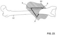 FIG.23 shows another application of the proposed method. In this variant, a position of threepoints8 is determined and the plane80 (resp. a part thereof) defined by the determined positions of these threepoints8 is calculated. A part of thisplane80 is displayed on the OHMD1. As shown inFIG.23, the part of theplane80 preferably comprises the threepoints8. This variant can be used to define and display sawing planes, e.g., for an osteotomy. In this variant, theplane80 preferably is displayed at a constant position and orientation, e.g., corresponding positon and orientation of the sawing plane.