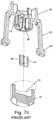 FIG.7a,FIG.7b, andFIG.7care respectively front, cross-sectional, and exploded views of an embodiment of aseptum holder58 described in IL237788.Septum holder58 is comprised of a disk shapedannular body60. Two equal length resilientelongated arms62 are attached to the sides ofbody60. The arms terminate with distalenlarged elements64. The bottom part ofbody60 is comprised of a cylindrical section that projects downward betweenarms62. Acavity66 is created in the bottom part ofbody60 into which is fitted aninsert68 comprising twobores70 that form the seat of a needle valve. In alternative embodiments insert68 can have different shapes than that shown and in one embodiment can be comprised of two separate pieces of tubing that are inserted into parallel bores of appropriate diameters created in the bottom part ofbody60.