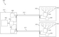 FIG.4 illustrates anexample antenna system400 according to example aspects of the present disclosure.Antenna system400 can includeradiofrequency circuit410 and twoantenna arrays420. It should be understood that twoantenna arrays420 are illustrated for the purposes of illustration, and more orfewer antenna arrays420 can be used in accordance with aspects of the present disclosure. For instance, in some embodiments, fourantenna arrays420 can be used. In some embodiments, each ofradiofrequency circuit410 and antenna array(s)420 can be disposed on separate circuit boards. For instance,radiofrequency circuit410 and its components can be disposed on a first circuit board and afirst antenna array420 and its components (e.g.,antenna elements422,front end module424, array controller426) can be disposed on a second circuit board.Additional antenna arrays420 can be disposed on additional circuit boards. As one example,antenna system400 can include a first circuit board and a second circuit board that is physically separate from the first circuit board. Themodulator circuits406 can be disposed on the first circuit board, and at least one of thearray controller426 or antenna array (e.g., plurality of antenna elements422) can be disposed on the second circuit board.