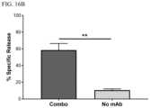 NK92MICD64cells were preincubated with either anti-FAP or anti-TROP2 mAb to dock the therapeutic antibody. Control NK92MICD64cells were also preincubated without any mAb. A 1:1 ratio of target cells (8×103cells total) and 1:1 ratio of αFAP-NK92MICD64were added to αTROP2-NK92MICD64cells (1.6×105cells total) at an E:T ratio of 20:1FIG.16A). Potent cell killing by the αFAP-NK92MICD64and αTROP2-NK92MICD64combination therapy was observed and percent (%) specific release was significantly higher than the NK92MICD64cells alone (FIG.16B). The baseline levels of killing are likely the rest of NK cells' multiple mechanisms of identifying and killing malignant cells (for example, activating receptors, expression of death ligands). These data suggest that the combination cell therapy is effective at killing both target cells. Theoretically, either monotherapy alone would only be able to kill, at most, 50% of the target cells in the co-culture since previous data shows selective killing of target-expressing cells.