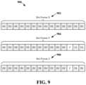 The first exemplary slot format902 (e.g., slot format X) includes 14 symbols. All 14 of the symbols of the firstexemplary slot format902 are DU symbols. The second exemplary slot format904 (e.g., slot format Y) includes 14 symbols. The first 11 symbols of the secondexemplary slot format904 are DU symbols, the 12thsymbol is an F symbol, and the final two symbols are UL symbols. The third exemplary slot format906 (e.g., slot format Z) includes 14 symbols. The first 11 symbols of the thirdexemplary slot format906 are DU symbols, the 12thsymbol is an F symbol, and the final two symbols are DL symbols. The exemplary slot formats are three of many possible combinations of DU plus F, DL, and/or UL symbols. Slot formats having fewer or greater numbers of symbols than the 14 symbols shown for each of the three exemplary slot formats ofFIG.9 are within the scope of the disclosure.