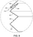 FIG.7 is a side view of the grip apparatus showing a first foldable pleat in its folded configuration, nested onto another foldable pleat, as pressure (arrow705) is applied to thetop member120 of thegrip apparatus100, with thegrip apparatus100 shown in a partially-collapsed configuration. Thefirst portion160 including theupper pleat262 and thelower pleat261 has been nested onto theadjacent pleat252, showing the grip apparatus in a partially-collapsed configuration. In this partially-collapsed configuration, a first foldedflap710 is formed.FIG.8 is a partial side view of the grip apparatus ofFIG.7, enlarged to show the foldable pleats in greater detail.FIG.9 is a cross-sectional view of the section as noted in dotted-line inFIG.8, enlarged to show the pleats or foldable sections of the center section in greater detail. In this configuration, note that thepleat261 is not visible from the exterior as it is fully nested onto theupper pleat252.