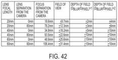 FIG.42 shows a table illustrating the corresponding fields of view about the optical axis for the corners of two configurations of an imaging system disclosed herein in accordance with an embodiment of the present disclosure;