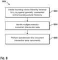 Atstep804, the rayintersection test unit304 identifies multiple nodes of the bounding volume hierarchy to perform intersection tests for concurrently. Note,step804 does not necessarily represent the first nodes for which intersection tests are performed for the bounding volume hierarchy. In an example, an intersection test is performed for a root node betweensteps802 and804. In some examples, identifying the multiple nodes for which to perform concurrent intersection tests includes examining a collection of nodes that the rayintersection test unit304 builds while traversing the bounding volume hierarchy. In an example, upon detecting that the ray intersects a box node, the rayintersection test unit304 places pointers to the children of that box node into the collection. In some examples, the rayintersection test unit304 executes a loop as described elsewhere herein. In the body of the loop, the rayintersection test unit304 selects multiple nodes from the collection if multiple nodes are present in the collection.