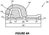 For example,FIG.3A is a plan view of a portion of a metallization pattern for a fieldeffect transistor device100 according to some embodiments. The metallization pattern includes asource overmetallization142, adrain overmetallization144, agate126 and afield plate140. Anactive region130 of thetransistor device100 is defined by the position of thesource122,gate126 and drain124 contacts illustrated inFIG.4A. The source overmetallization142 is connected to thesource contact122 by a conductive via143, and thedrain overmetallization144 is connected to thedrain contact124 by a conductive via145. The source anddrain contacts122,124, may include a metal, such as TiAIN, that can form an ohmic contact to Group III nitride-based materials. The source and drain overmetallizations may be formed using a metal or other highly conductive material, including, for example, copper, cobalt, gold, and/or a composite metal. Thegate126 may include a metal capable of making a Schottky contact to a nitride based semiconductor material, such as Ni, Pt, NiSix, Cu, Pd, Cr, TaN, W, and/or WSiN.