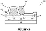 Referring toFIGS.4A and4B, a transistor device according to some embodiments is illustrated. In particular,FIGS.4A and4B illustrate a highelectron mobility transistor100 formed on asubstrate112. Achannel layer116 is formed on thesubstrate112, and abarrier layer118 is on thechannel layer116.