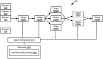 Thebatch orchestrator510 may monitor the processing of a plurality ofelements300 through theworkflow402. In a typical implementation, there may be many thousands ofelements300. Thebatch orchestrator510 may record the state of execution of eachelement300 in adatabase2602. For example, a binaryworkflow state vector2604 may be used to record the state of execution of eachelement300 with respect to theworkflow402. For example, each stage may be represented by a vector of the form A1b1b2b3 . . . bn, where A1 is value identifying the stage and b1, b2, b3, . . . bn are bits such that each bit position represents an element and is set to 1 when that stage is completed for the element represented by that bit position. Alternatively, A1 may be an identifier of an element and each bit position may represent a stage such that that bit position is set to 1 when the stage represented by it is complete.