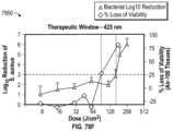 Most in-vitro assays against bacteria are conducted in a cell-free system. There are two classic or industry standard measurements for anti-bacterial activity. The first is related to inhibition of growth and may be quantified in terms of a minimum inhibitory concentration (MIC). The MIC refers to the dose required to completely inhibit growth of bacteria over a 24-hour period in a broth/growth medium. Given the rapidly dividing nature of bacteria, any growth leads to high concentration of microorganism. Stated differently a 50% reduction is not sufficient for bacteria infections. A second standard is related to bactericidal results and may be quantified in terms of a minimum bactericidal concentration (MBC). The MBC refers to the dose required to result in a 3 log reduction (e.g., 99.9%) of bacteria. Assays can be run in PBS or broth/growth media and lead to different results and time is also a variable. In general, for the bacterial experiments described above, the MIC dose for a given organism has typically been greater than the MBC determined in phosphate buffered saline.