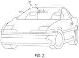 FIG.2 shows a forward-facing position for acamera system10 in thevehicle100. The camera system ormodule10 can be attached to thewindshield102, as shown, such as via a frame or bracket that is adhesively attached at the windshield via a plurality of fixing elements or attachment elements. Other positions are also possible. The camera system or camera module of the present invention may utilize aspects of the systems and/or modules described in PCT Application No. PCT/US2012/048993, filed Jul. 31, 2012 and published Feb. 7, 2013 as International Publication No. WO 2013/019795, and/or U.S. Pat. Nos. 8,256,821; 7,480,149; 7,289,037; 7,004,593; 6,824,281; 6,690,268; 6,445,287; 6,428,172; 6,420,975; 6,326,613; 6,278,377; 6,243,003; 6,250,148; 6,172,613 and/or 6,087,953, and/or U.S. patent application Ser. No. 11/721,406, filed Jun. 11, 2007 and published Dec. 3, 2009 as U.S. Publication No. US-2009-0295181, which are all hereby incorporated herein by reference in their entireties.
