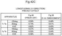 Also, referring toFIGS.42B and42C, outside the azimuth θ=−35° and θ=35°, the relative luminous intensity I1/I0at θ=±35° and the relative luminous intensity I2/I0at θ=±45° are slightly smaller in the apparatus ofFIG.38 than in the apparatus ofFIG.48, and therefore, the privacy effect is much better in the apparatus ofFIG.38 than in the apparatus ofFIG.48.