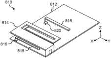FIG.11 illustrates an example embodiment of amodal antenna810 that can be used in accordance with aspects of the present disclosure. Themodal antenna810 may include a circuit board812 (e.g., including a ground plane) and a drivenantenna element814 disposed on thecircuit board812. An antenna volume may be defined between the circuit board (e.g., and the ground plane) and the driven antenna element.