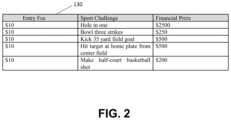 In the illustrated example, entry fees are shown as being uniform and the prize amounts varied. Additionally or alternatively, different entry fees may be paid for the opportunity to win a uniform amount from a plurality of different sport challenges. Additionally or alternatively, entry fees for the opportunity to attempt particular sport challenges may be the same or different and the financial prize for successful completion of the sport challenges may be the same or different.