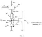 Using a replica PA allows for adjustment of the gate bias of thePA316 in order for thePA316 to track a specified amplitude modulation (AM) to AM curve with predictable gain expansion and compression across process, voltage, and temperature (PVT) variations. Since load variation is relatively slow as compared to the envelop variation at the output of thePA316, a slow tracking loop may be used to adjust the gain ofPA316. For instance, slow active circuits (e.g.,average voltage detectors706,708) may be used to save current consumption. Moreover, the average voltage swing at the output of thePA316 andPA390 may be used. For example,average voltage detectors706,708 may in effect extract the baseband envelope from the output voltages ofPAs316,390 and filter out the envelope of the voltages at outputs of thePAs316,390 which would otherwise interact with the signal at the gate oftransistor814 to create a third-order intermodulation (IM3) signal component at the output of thePA316.