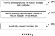 As shown inFIG.5, one method variation of selecting a message transmission plan and executing the message transmission plan can include: receiving a messaging request through an application programming interface, the messaging request being associated with message-associated delivery attributes (S110); determining a set of message transmission options based on the message-associated delivery attributes (S120); and transmitting the message, where the conditions and/or properties of transmitting the message are defined in part by the set of message transmission options (S130). The message transmission options may be based on one or more of various timing properties, reliability properties, quality properties, value properties, and/or other types of properties.