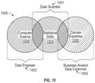 FIG.15 is a Venn diagram1500 which illustrates a skill set required of adata scientist1501 expertly skilled in the art. Adata scientist1501 expertly skilled in the art should have a background incomputer science1504, havestatistical skills1505 and should havedomain expertise1506. One ordinarily skilled in the art should have a background which includes at least a subset of these arts. For example, adata engineer1502 should have a background incomputer science1504. A businessanalyst data customer1503 should havedomain expertise1506 and havestatistical skills1505.
