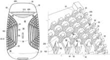 In yet another embodiment, shown inFIG.33, the first arms are configured as agrouping58 of a plurality of biasing arrays72 (shown as six (FIG.33)) arranged between anupper end portion60 of the central portion and an upperperipheral edge62 of the shell, which may includeupper portions65 of the outer peripheral edges. Each biasingarray72 extends radially from theupper end portion60, which has a curved perimeter. Thearrays72 are symmetrically arranged on either side of theaxis64.