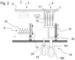 Generally, it is furthermore advantageous both for producing a homogeneous field and for a homogeneous distribution of the process gas, to have the electrodes orlances15 centered by appropriate means such as centering or positioning means, so thatlances15 extend along the central axis of the syringe barrels250. The same applies to the spray nozzles. The latter are likewise preferably centered relative to the central axis of the syringe bodies or, more generally, of the containers to be coated, in order to obtain a uniform thickness of the organic film. The centering may be effected, for example, using at least one adjustable clamping means, which centers the electrodes or spray nozzles in axially symmetric relationship to the containers accommodated in the container receiving means. In a modification of the invention, at least one adjustable clamping means may be provided as a part of the centering means, which centers the transfer means along with the container receiving means with respect to the treatment tools in an axially symmetric relationship.