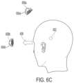 FIGS.6A-6C illustrate examples of mixed reality spatialized audio, according to some embodiments. Spatialized audio can create a plausible three-dimensional MRE (e.g., MRE150) experience in a similar manner as persistent visual content. As a user walks around a real environment (e.g., real environment100), the user may expect to see persistent virtual content behave like real objects (e.g., the persistent virtual content appears larger as a user approaches it and gets smaller as the user moves away). Similarly, a user may expect sound sources to behave as if the sound sources existed in a real environment while the user moves around (e.g., a sound source may sound louder as a user approaches it and may sound softer as the user moves away). In some embodiments, immersive, spatialized audio can be controlled by manipulating a sound source with respect to a user's head—for instance, through a “delayed follow” effect. For example, one or more sound sources can be spaced around and/or tied to a user's head in a first position. At the first position, the one or more sound sources may be located at designated positions, which may be positions intended (e.g., by a developer or audio designer) for sound sources to produce a particular audio experience. A sound source's position can correspond to an origin of the sound source—e.g., a coordinate in a MRE from which the sound appears to originate. A sound source origin can be expressed as an offset (e.g., a vector offset) from a user's head (or other listener position); that is, presenting a sound to a user can comprise determining an offset from a user's head, and applying that offset to the user's head to arrive at the sound source origin. A first position of the user's head at a first time can be determined, for example by one or more sensors of a wearable head device, such as described above (e.g., with respect to wearable head device401A). A second position of the user's head at a second, later time can then be determined. Differences between the first and second positions of the head can be used to manipulate an audio signal. For example, in some cases, when the user moves their head to the second position, the one or more sound sources can be instructed to “trail” the movement of the head such that the position of sound sources may deviate from their designated positions, which may be spaced around and/or tied to the user's head (e.g., the designated positions spaced around and/or tied to the user's head may move/change in relation to the user's head, and the sound sources may no longer be located at their designated positions spaced around and/or tied to the user's head). This manipulation of the sound source can be implemented, for example, by moving the sound source origin from a first position, by an amount less than a difference between the first and second positions of the head. In some embodiments, designated positions may remain fixed relative to a user's head position, but corresponding virtual sound sources may be “elastically” tied to the user's head position, and may trail behind a corresponding designated position. In some embodiments, the sound sources may return to their designated positions spaced around and/or tied to the user's head (e.g., the same positions intended to produce the particular audio experience) at some point after the user's head has reached the second position. Other manipulations of the sound source origin, such as others that determine the origin based on a difference between first and second head positions, are contemplated and are within the scope of this disclosure. More generally, custom audio dynamics can be created by manipulating the origin of a sound source with respect to the user's head, or to some other object (including a moving object) in a MRE. For instance, the sound source origin can be defined as a function of a user's head position and orientation, or functions of the change or accumulation of the head position or orientation over time (e.g., functions of integrals or derivatives of the head position or orientation). Such functions can be used for creative effect, such as to simulate a sound traveling at a particular velocity, or in a particular direction. For instance, a velocity of a user's head movement can be determined (e.g., as the derivative of the head movement, determined by one or more sensors of a wearable head device as described above), and a sound can be presented as if the sound origin is traveling at that same velocity (or a different velocity based on the head's velocity). As another example, a change in orientation of a user's head can be determined, such as via one or more sensors of a wearable head device such as described above, and a sound can be presented as if the sound origin is moving with an orientation based on the change in the user's head orientation. Expressing a sound origin as a function of the user's head position or orientation can also be adapted to gracefully handle situations that would otherwise cause undesirable audio results. For example, by defining a function that limits the degree to which sound sources move relative to a user's head, extreme or unwanted audio effects from those sound sources can be limited or avoided. This can be implemented, for instance, by establishing a threshold rate of change of the user's head position; if the rate of change exceeds the threshold, the change in position of a sound source origin can be limited accordingly (e.g., by setting the origin to a first coordinate if the threshold is exceeded, and setting the origin to a different coordinate if the threshold is not exceeded). As another example of avoiding unwanted audio effects, a sound source origin can be configured to always remain at least a minimum distance from the user; for instance, if the magnitude of an offset between the sound source origin and the user's head falls below a minimum threshold, the origin can be relocated to an alternate 