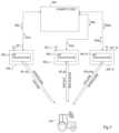 InFIG.3, ablock109 illustrates the bandwidth where the signal transmitted byantenna system124 is received byradio device128. The bandwidth illustrated byblock109 is centered on a frequency f1(full line,112) smaller than frequency fc. Ablock110 illustrates the bandwidth where the signal transmitted byantenna system125 is received byradio device128. The bandwidth illustrated byblock110 is centered on a frequency f2(dotted line,113) greater than value fc. The different signals to be recombined are thus received with frequency offsets, which adversely affects the proper restoring of the signal.