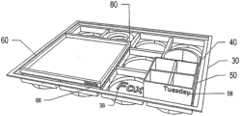 CONCLUSION, RAMIFICATIONS AND SCOPEThus the reader will see that the base tray and container modules of the invention provide unique benefits including letting different types of users in a wide variety of situations adapt the food containers they use each time to their unique needs; reduce spills, risk of damage and injury, embarrassment, materials cost, and environmental impact; and providing a unique identifier that reduces waste, confusion of ownership, embarrassment, and exposure to another person's germs.