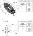 FIGS.3C and3D also show the coils ofwire35 that are wound aroundtoroidal cores36, consisting of high-permeability material (e.g., Supermendur). Lead wires (not shown) for thecoils35 pass from the stimulator coil(s) to the impulse generator (310 inFIG.1) via theelectronics port32. Different circuit configurations are contemplated. If separate lead wires for each of thecoils35 connect to the impulse generator (i.e., parallel connection), and if the pair of coils are wound with the same handedness around the cores, then the design is for current to pass in opposite directions through the two coils. On the other hand, if the coils are wound with opposite handedness around the cores, then the lead wires for the coils may be connected in series to the impulse generator, or if they are connected to the impulse generator in parallel, then the design is for current to pass in the same direction through both coils.