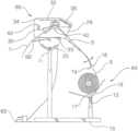 The second vertical stand has apaper roll cradle16 supported by thesecond stand13. Thecradle16 includes a front rectangular panel ortray51 extending from a pair of spaced apart trapezoid shapedside plates152,153 at a selected upward angle of less than 90 degrees and preferably about 60 degrees forming an upward sloped wall having an upper edge defining an outward turnedlip54 bent downward at about a 15 degree angle. The bottom of thepanel51 may be bent upward forming a bottom inward facinglongitudinal flange57 horizontal with the floor. A rear stop bar orroller guard56 extends from the opposing top corners of the trapezoid shaped side plates. A rear longitudinal member, comprising a length of angle iron55, extends between the bottom rear corners of the trapezoid side panels below and aligned with therear stop bar56, with the bottom flange turned inward and the top flange turned upward. A horizontal paper roll idler roller comprising a cylinder (paper roll support cylinder)17 preferably having ball or roller bearings is affixed to the bottom center section of the opposing trapezoid shaped side plates spaced apart from and between the front rectangular panel and the rear longitudinal member. In one preferred embodiment, the paper roll support cylinder is spaced about five inches from the panel. The paperroll support cylinder17 extends about one inch above an inside surface59 of thepanel51 and parallel to thepanel51 and rear longitudinal member55.