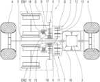 In the example shown inFIG.1, the electric machines EM1, EM2 are arranged one behind the other, as viewed in the vehicle longitudinal direction, at each side of anoutput shaft16 of the differential3, wherein their longitudinal axes extend parallel to theoutput shaft16 of the differential3. Moreover, the electric machines EM1, EM2 (considered as a unit), thetransmission2, and the differential3 are arranged in series transversely to the vehicle longitudinal direction, wherein thetransmission2 and the differential3 are arranged concentrically to theoutput shaft16 of the differential3.