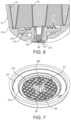 As indicated in detail section G, the planar lower face of theengagement plate24ais thus pressed onto the protrudingengagement portion8cbetween thecentral aperture8aand theperforated area8b. The preferred flow path E (seeFIG.5b) within the cartridge is closed and the injected liquid will then pass theperforated area8bas indicated by arrows H. The increase in pressure in the second compartment3 (arrow I) will then lead to deformation of themembrane11 against the opening means21bof thecartridge support21. The liquid ejected from thecartridge1 will then flow to a centralcircular guiding channel26 of the opening means21b(arrows J) and will be drained from a lower face of thecartridge support21.