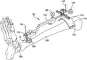 As illustrated inFIG.27, apin150 is inserted into each of thepin sleeves176 and through both cortices of thetibia260. Once thepins150 are placed, thepin sleeves176 are removed and thesecond knob108 anddistal knob196 are loosened to remove thealignment frame assembly140. Theproximal tibial pin154 orknee bracket142 and thefirst guide pin50 are then removed, leavingpins150 in thetibia260, as illustrated inFIG.28.