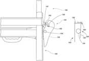As seen inFIG.14, thelocking mechanism104 may include abracket153 configured to be coupled with, for example, anouter rail105 of thefirst assembly102, a pin or other connectingstructure154 pivotally coupling thelever152 with thebracket153, a pin or other connectingstructure155 pivotally coupling thelever152 with theengagement pin150, and a biasing156 member that provides a desired biasing force between thelever152 and thebracket153. Thelocking mechanism104 may also include asleeve157 through which theengagement pin150 passes and which helps to facilitate alignment and engagement of theengagement pin150 with the openings or apertures of the rails in thefirst assembly102.