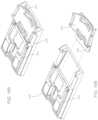 FIGS.14A-14D depict an embodiment of an alternative mechanism for securing a thoracic plate to a support structure. As seen inFIGS.14A and14B,thoracic plate1402 may be clipped into position onsupport structure1400. When first brought into contact withsupport structure1400,apertures1404 ofthoracic plate1402 may be positioned over one ormore clamping arms1406 of thesupport structure1400. Oftentimes, each side of thesupport structure1400 includes one or more clamping arms that are controllable independent of clamping arms on the other side of the support structure, however in some embodiments both sides of clamping arms may be controllable using a single actuator. Clampingarms1406 may be slidable and/or pivotable by actuating one or more buttons, levers, orother mechanisms1408, which may be positioned on or extending from an outside surface of thesupport structure1400. For example, themechanism1408 may be moved toward thesupport structure1400 to maneuver the clampingarms1406 from a receiving position that allows the clampingarms1406 to be inserted withinapertures1404 and to be moved away from the support structure to maneuver the clampingarms1406 to a locked position in which the clampingarms1406 contact a portion of thethoracic plate1402 proximate to theapertures1404. As seen inFIG.14C, in the receivingposition clamping arms1406 are disengaged from thethoracic plate1402 allowing it to be positioned on or removed from thesupport structure1400. As shown inFIG.14D, clampingarms1406 are in the locked position, with themechanism1408 in a position pulled away from the surface of thesupport structure1400. Ends of the clampingarms1406 may overlap with and engage a top surface of thethoracic plate1402, thereby maintaining thethoracic plate1402 in position relative to thesupport structure1400.