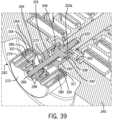 The slower rate of speed provided by the dwell surfaces328 may result in lower impact forces between thehooks302 of theselector262 and theside wall318 of the base264 during movement of theselector262 from the disengaged or unselected position ofFIGS.37 and38 to the engaged or selected position ofFIGS.39 and40. As previously discussed, thehooks302 may be biased radially outwardly by the bias members294 (seeFIGS.33 and40). Thehooks302 may be nominally positioned relative to theside walls318 such that at least a portion of thebarbs304 are positioned in interfering relationship with theside walls318 to ensure thehooks302 engage theapertures332 of theside walls318 when theselector262 is in the engaged or selected position. As such, during movement of theselection assembly262 from the disengaged or unselected position to the engaged or selected position, thehooks302 may contact theside walls318, which may drive thehooks302 and thus themovable members290 radially inwardly, thereby compressing thebias members294 and permitting thehooks302 to slidably pass along an inner surface of theside walls318. Thehooks302 may initially contact thedistal end face334 of theside wall318 when theposts280 are moving along the dwell surfaces328, thereby resulting in lower impact forces due to the slower speed. To further reduce the impact forces, the obliquely-angledproximal surfaces308 of thehooks302 may contact therounded edge336 of thedistal end face334 of theside wall318 of thebase264, thereby facilitating inwardly movement of thehooks302 relative to theside wall318 with lower impact forces.