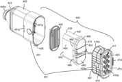 FIG.33 is an exploded, schematic, perspective view analogous toFIG.32, but taken from a perspective toward an outlet end of the housing.