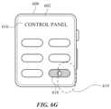 AtFIG.6D, theelectronic device600 is in the second mode of operation (e.g., normal mode), in which the third input mechanism (e.g., physical button612) are enabled for user input, as discussed above. As depicted inFIG.6D, while theelectronic device600 is in the second mode, theelectronic device600 detects, via the enabled third input mechanism (e.g., physical button612), an input (e.g., a push input613). In the depicted example, theelectronic device600 detects thepush input613 when the touch-sensitive display602 displays a “home” or home user interface. As such, theelectronic device600 interprets thepush input613 as indicative of a request to access (or activate) a particular user interface (e.g.,menu614 depicted inFIG.6E).