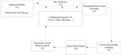 FIG.1 shows an example training system in accordance with some aspects of the present technology.Collaboration system110 takes in media data, such as one or more of media data (e.g., audio data, video data, etc.) from a collaboration service, such as an assistant device, conferencing service, calling service, meeting service, messaging service, etc. While multiple types of media data can be used (such as data relating to wakewords, face recognition, picture, speech to text, etc.), for simplicity the following example embodiments will refer to audio data as making up the media data.