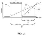 In such an example arrangement, theanalog circuitry160 shown inFIG.1G also can include comparator circuitry to determine when theoutput signal220 of the first integrator circuitry is less than theoutput signal230 of the second integrator circuitry. The comparator circuitry can be powered on at the falling edge of thesquare pulse170 and can be powered off when a magnitude of the time-dependent output signal220 is less than the time-dependent output signal230. Output signal from the comparator circuitry can span a time interval equal to the width w. The analog circuitry can combine thesquare pulse170 with the output signal from the comparator circuitry to yield a pulse signal having a defined width w′ corresponding to γw, where γ is the ratio between the second defined slope and the first defined slope. As is illustrated inFIG.2, in an example configuration in which γ=2, w′ is equal to 2w.