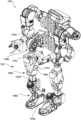One example of arobotic system100 is generically and graphically illustrated inFIGS.1A and1B. Therobotic system100 is shown in the form of an exoskeleton, and particularly a lower or lower body exoskeleton wearable by a user about the lower body. However, this is not intended to be limiting in any way as the concepts discussed herein can be applicable to and incorporated into or implemented with various types of robotic devices, such as exoskeletons (both upper and lower body exoskeletons), humanoid robots or robotic devices, teleoperated robots or robotic devices, robotic arms, unmanned ground robots or robotic devices, master/slave robots or robotic devices (including those operable with or within a virtual environment), and any other types as will be apparent to those skilled in the art. In other words, with therobotic system100 in the form of an exoskeleton as an example, the exoskeleton(s) as disclosed herein can be configured as a full-body exoskeleton, such as that shown inFIGS.1A and1B, or as only a lower body exoskeleton (e.g., some or all of the lower body portion of the exoskeleton ofFIGS.1A and1B), or as only an upper body exoskeleton (e.g., some or all of the upper body portion of the exoskeleton ofFIGS.1A and1B).