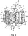FIG.17 depicts an end cross-sectional view of the end effector ofFIG.3 with another exemplary wedge sled captured between the cartridge body and the cartridge tray of the staple cartridge of the end effector, showing the wedge sled having toed-in inner sled rails;