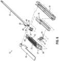 As best seen inFIGS.4A-4B, firing beam (14) of the present example includes a transversely oriented upper pin (38), a firing beam cap (44), a transversely oriented middle pin (46), and a distally presented cutting edge (48). Upper pin (38) is positioned and translatable within a longitudinal anvil slot (42) of anvil (18). Firing beam cap (44) slidably engages a lower surface of lower jaw (16) by having firing beam (14) extend through lower jaw slot (45) (shown inFIG.4B) that is formed through lower jaw (16). Middle pin (46) slidingly engages a top surface of lower jaw (16), cooperating with firing beam cap (44). Thereby, firing beam (14) affirmatively spaces end effector (12) during firing. By way of example only, firing beam (14) and/or associated lockout features may be constructed and operable in accordance with at least some of the teachings of U.S. Pat. No. 9,717,497, entitled “Lockout Feature for Movable Cutting Member of Surgical Instrument,” issued Aug. 1, 2017, the disclosure of which is incorporated by reference herein in its entirety. Other suitable forms that firing beam (14) may take will be apparent to those skilled in the art in view of the teachings herein.