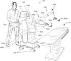 Similarly, as shown inFIG.39D, the user may toggle, slide, seconddigital actuator3908 ondisplay210, e.g., left, right, up, down, and/or diagonally, withincursor pad3910 to cause corresponding horizontal and/or vertical movement of the stages of the robot arm relative to the platform. In addition,display210 may display one or more indicators, e.g.,vertical indicator3912aandhorizontal indicator3912b, to inform the user of the current vertical and horizontal configuration of stages of the robot arm in real-time. For example, the position ofindicator3912a, e.g., relative tocursor pad3910, may be moved responsive to actual vertical movement of the robot arm via actuation of seconddigital actuator3908, and the position ofindicator3912b, e.g., relative tocursor pad3910, may be moved responsive to actual horizontal movement of the robot arm via actuation of seconddigital actuator3908. Seconddigital actuator3908 may automatically return to a neutral position (e.g., a center position on cursor pad3910) upon release of seconddigital actuator3908 by the user; whereas,indicators3912a,3912bmay remain in respective positions relative tocursor pad3910 to accurately indicate the vertical and horizontal configuration of the robot arm relative to the platform. In some embodiments, the distance of seconddigital actuator3908 from the center point ofcursor pad3910, as actuated by the user, may determine the velocity of movement of the stages relative to the platform. For example, by moving seconddigital actuator3908 only a short distance from the center point ofcursor pad3910, the stage will move in the base of the robot arm in a corresponding direction at a first velocity, and by moving second digital actuator3908 a larger distance from the center point ofcursor pad3910, the stage will move in the base of the robot arm in the corresponding direction at a second velocity greater than the first velocity. Movement of the base of the robot arm via the stage assembly in the corresponding direction may slow down as the stage assembly approaches its maximum range of extension relative to the platform until reaching a complete stop. As described herein, if the distal end of the robot arm is coupled to a surgical instrument, e.g., positioned through a trocar, movement of the base of the robot arm via the stage assembly via user input at the graphical user interface may further automatically cause movement of the robot arm via one or more of the motorized joints of the robot arm so as to maintain a static position of the surgical instrument during movement of the stages. Moreover, the system may generate an alert when the stage assembly and/or robot arm reaches or nears its respective maximum extension limit.