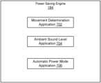 As illustrated, thepower saving engine184 includes amovement detection application702, an ambientsound level application704, and an automaticpower mode application706.