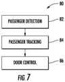 Passenger tracking system70 can be specially designed to utilize depth map data. Tracking may be regarded as a Bayesian Estimation problem, i.e., what is the probability of a particular system state given the prior system state, observations, and uncertainties. In such tracking, the system state may be the position of the tracked object, e.g, location and, possibly, velocity, acceleration, and other object characteristics, e.g., target features as disclosed elsewhere herein. The uncertainties are considered to be noise. Depending on what simplifying assumptions are made for mathematical tractability or efficiency, the Bayesian Estimation becomes the variants of Kalman Filtering (assumption of Gaussian additive noise) or the variants of Particle Filtering (assumption of non-Gaussian noise). In 2D and 3D object tracking, where there are many pixels/voxels on target, the system state often includes a target representation that includes discriminative information such as color descriptors (2D only), shape descriptors, surface reflectivities, etc. The possible target models are sensor and application specific.
