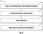 The morphological filtering is further explained in reference toFIG.5. In 3Dmorphological filtering51, accounting for occlusion can be performed in multiple steps (e.g., as shown inFIG.5 which can include four successive steps). A 2D foreground object mask can be computed by depth background subtraction (step53). Foreground objects within the mask can be at any depth, and partially or completely occlude objects therebehind.