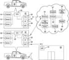 For example, if building140 were robbed, a local Wi-Fi transceiver141 may communicate an alarm to surroundingvehicles120, which can go on high-alert themselves as well as provide active camera data gathering. Thecloud150 can extend the range of the signals to a larger group ofvehicles100 in the locality as well as provide enhanced data aggregation and analysis (e.g., vectoring of possible suspects, speed of suspects, areas of last detection, etc., based on camera aggregation and analysis). Active alerts may be stored in analert database165, for distribution to vehicles newly entering an alert zone (e.g., parking near a store that was just robbed or a vehicle that was just broken into).