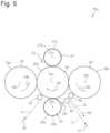 Like thethird roller24, thefifth roller28 has a fifth outercircumferential face28shaving a cylindrical shape and being opposed to the first outercircumferential face20sof thefirst roller20.