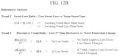 FIG.11A shows a table of various sweat characteristics including basic ratio for sweat flow rate, body surface area calcs, and sweat loss & body mass loss calcs.