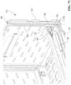 FIG.22 is an enlarged view of the rightvertical portion227 of theframe240 ofFIG.21, again with the front portion of thevertical portion227 removed for visibility. The left side of the front wall215 (FIG.21) would be a mirror image. Thelower beam225 includes avertical portion258 extending upward at an outer end thereof and slidably captured within thetrack246 of thevertical portion227 of theframe240. At an upper end of thevertical portion258 is an inwardly-turnedhook portion260. Similarly, themid beam224 includes avertical portion262 extending upward at an outer end thereof and slidably captured within thetrack246 of thevertical portion227 of theframe240. At an upper end of thevertical portion262 is an inwardly-turnedhook portion264. Thevertical portion262 of the mid portion is inward of thevertical portion258 of thelower beam225.