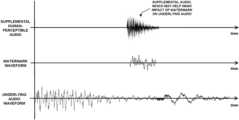 FIG.4 is a variation of the timing diagram ofFIG.3, showing overtly human-perceptible supplemental audio content that would be added to the media stream with time positioning coincident with the audio watermark, to help mask audio effects of the audio watermark on the underlying audio content of the media stream.