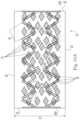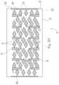 FIG.12D is a top view of a cleaning article according to the present invention and having discrete tufts represented as diamonds, with pared, interrupted variable width chevron secondary bonds, forming herring bones oriented in the longitudinal direction with offset zones for collection of debris.